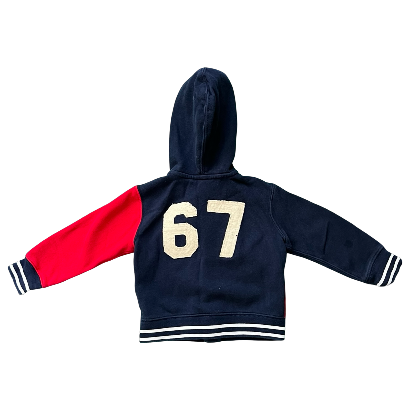 This Ralph Lauren hoodie in red and navy is designed for toddlers aged 2 years. Made from a soft cotton fleece blend, it offers warmth and comfort for everyday wear. Its gentle condition ensures it’s ready for more adventures.