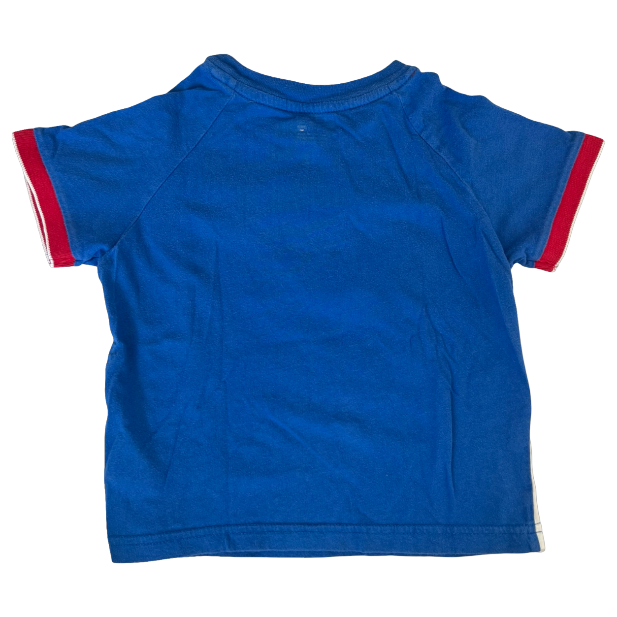 This Ralph Lauren Blue Italia T-shirt for 2-year-olds features soft cotton fabric in blue and red, offering comfort and style for your little one.