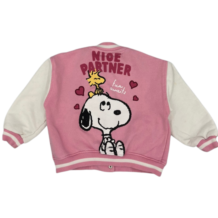 This Zara Pink Snoopy Bomber for 12-18 months is a playful and trendy jacket made from soft cotton. It’s well loved with a few small stains, perfect for adding a fun pop of pink to your little one’s wardrobe. Note: slightly stained.