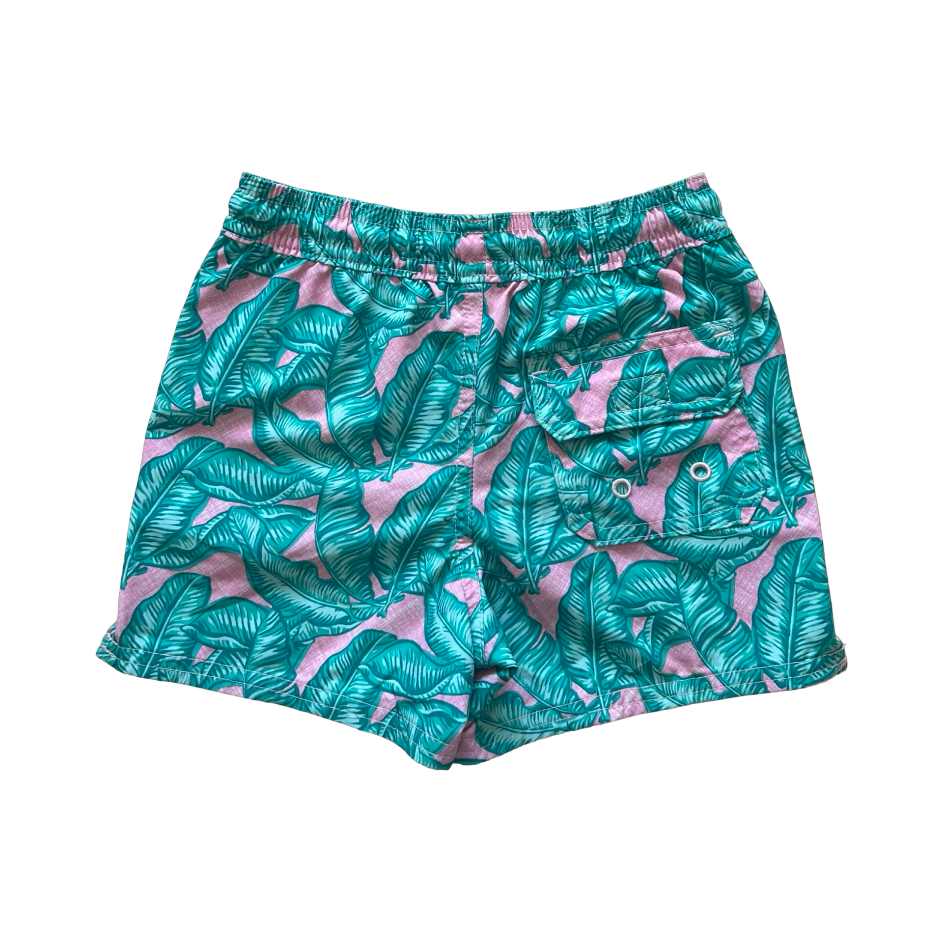 These playful Vineyard Vines Banana Leaf swim trunks in size 3T feature a fun green and pink design.