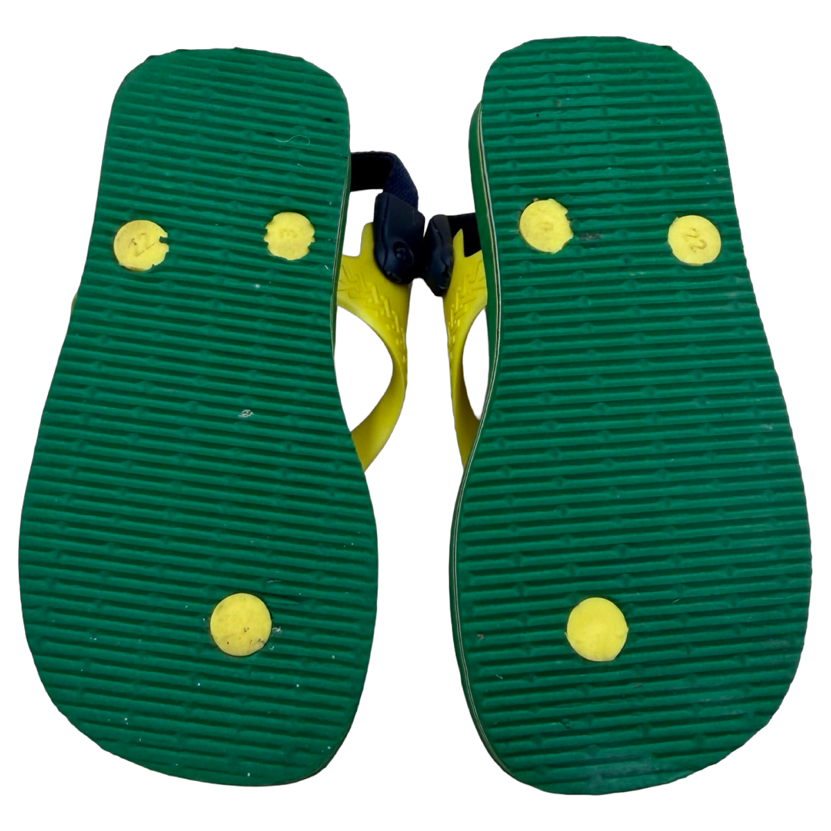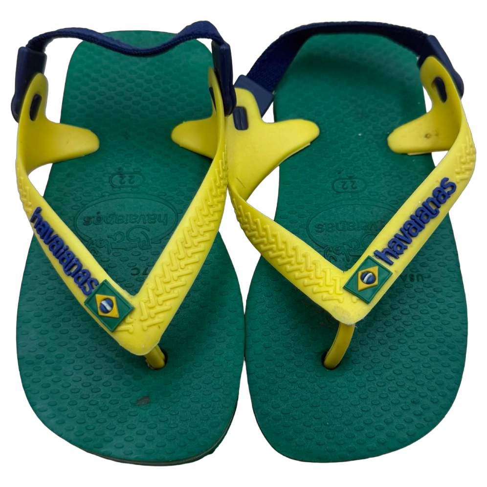 Havaianas Brazil flip flops in a fun green and yellow combo. Perfect for casual summer days and beach trips. Gently used and ready for new adventures!