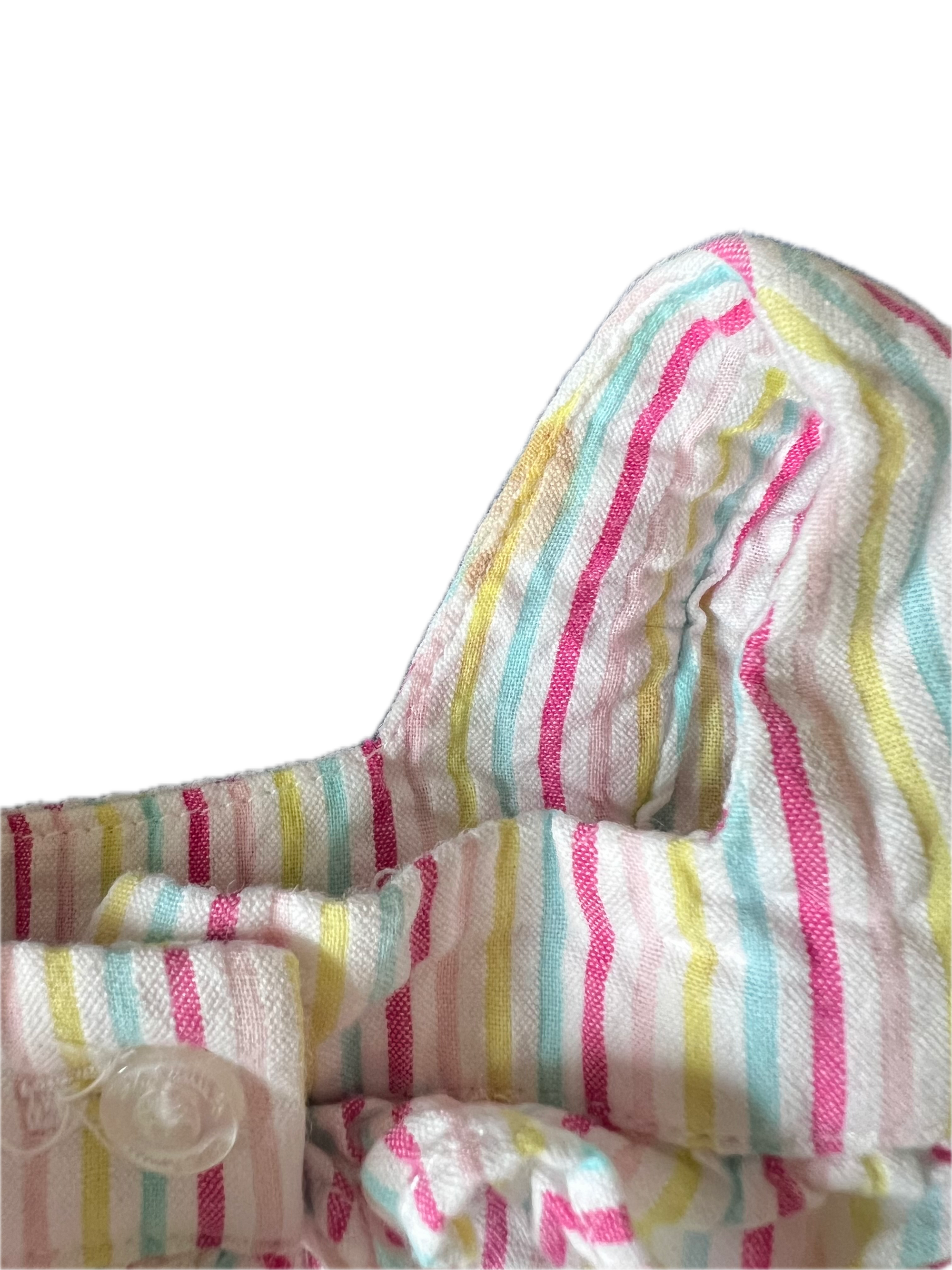 The Cadet Rousselle Rainbow Stripe Shirt for 18 months features vibrant stripes and soft cotton fabric. This like-new top from Cadet Rousselle adds a cheerful splash of color to your little one’s wardrobe. Perfect for playful days and comfy wear. Minor stain inside collar.