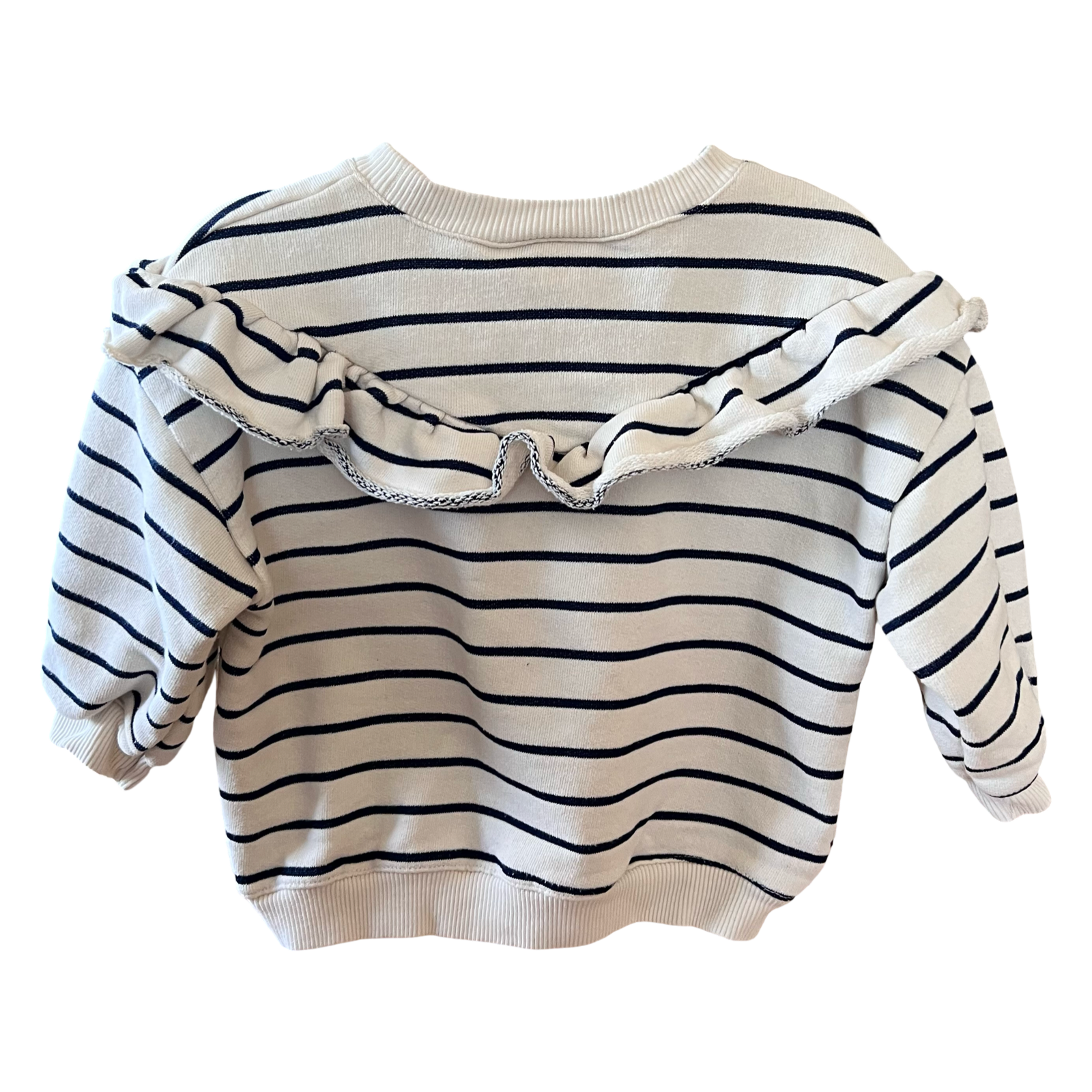 This Zara blue striped sweatshirt for 18-24 months is a cozy cotton top perfect for little ones. Featuring a playful white and blue design, it’s gently used and tends to run a bit large, making it great for layering and growing toddlers.