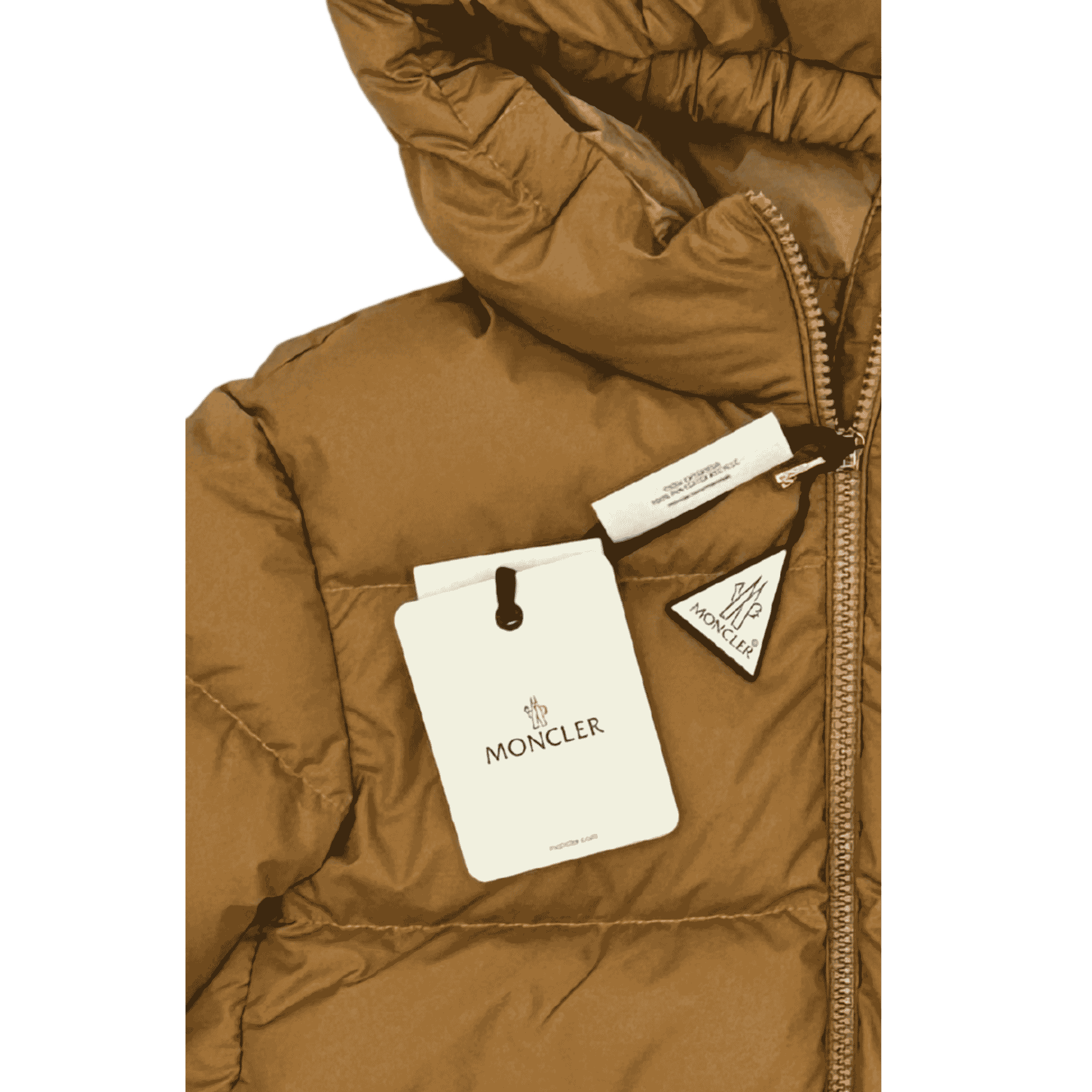 Stay cozy and stylish this winter with the Moncler Kids' Tan Claritia Down Puffer Jacket! This trending piece features premium down insulation wrapped in durable polyester, keeping little ones warm without the bulk. The classic tan hue pairs effortlessly with any outfit, while the quality construction ensures it'll be a winter wardrobe staple for seasons to come. Brand new with tags, it's ready to make a statement on the slopes or around town.