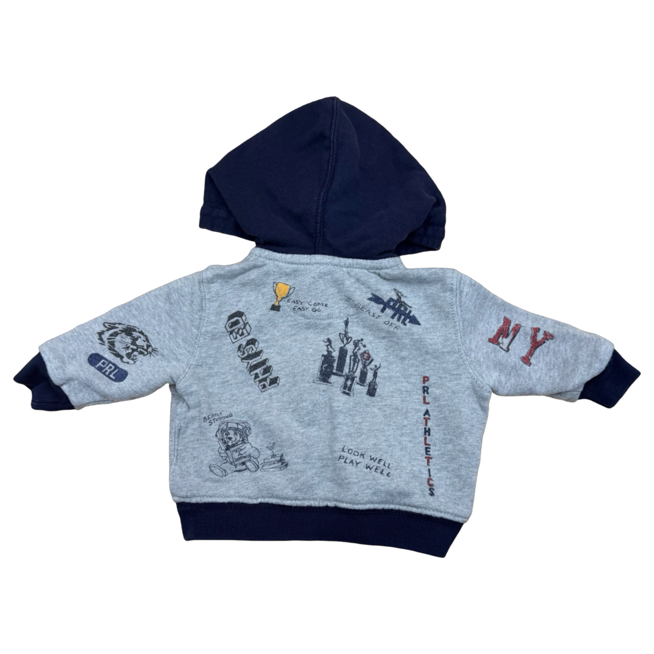 Cozy Ralph Lauren hoodie in soft grey cotton—perfect for keeping little ones warm and comfy. Classic style featuring sketches of NYC and school time classics.